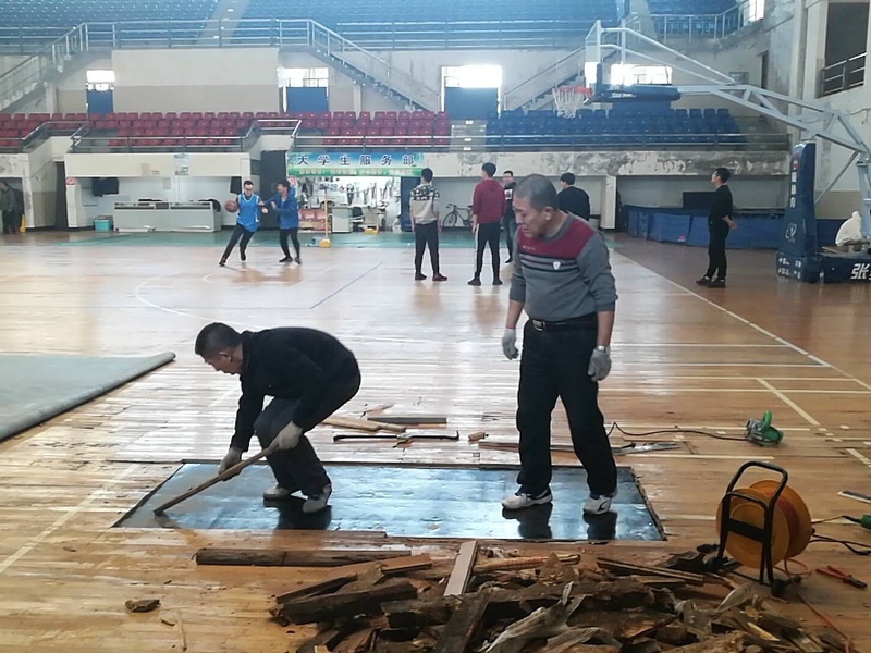 本网讯(通讯员 朱景宏)11月26日,林园校区体育馆羽毛球场地地板由于年久失修、天棚漏雨等因素再次出现多处起鼓、腐烂现象,严重影响了教学安全和体育馆正常使用。场馆中心管理人员在教研部无法投入维护费用的状况下,从自家拿来工具,借来电锯,在部分教师和安全处、后勤处同志的协助下,自己动手对部分损毁的地板进行了及时的维修,确保了正常的使用功能。