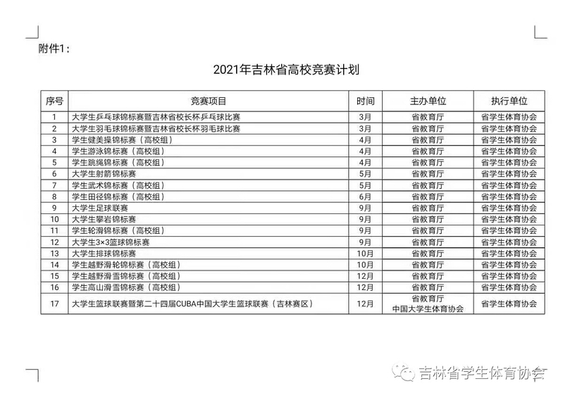 2021年吉林省高校体育竞赛计划